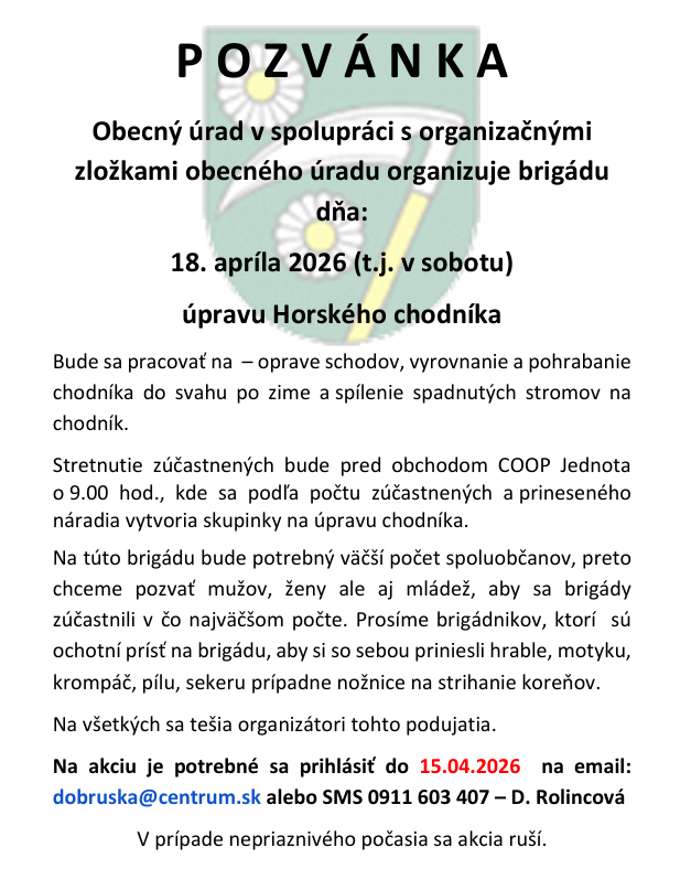 Obecný úrad v spolupráci s organizačnými zložkami obecného úradu organizuje v sobotu 18.4.2026 od 9:00 hod brigádu na úpravu Horského chodníka.