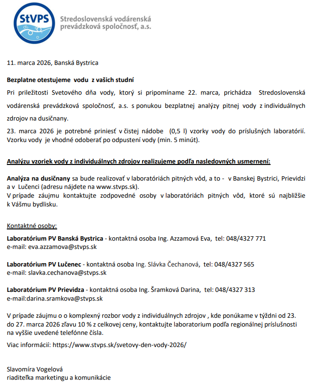 Ponuka bezplatnej analýzy pitnej vody z individuálnych zdrojov na dusičnany, ktorú Stredoslovenská vodárenská a prevádzková spoločnosť, a.s. ponúka pri príležitosti Svetového dňa vody. Viac informácií o podujatiach k Svetovému dňu vody nájdete na - viď link nižšie