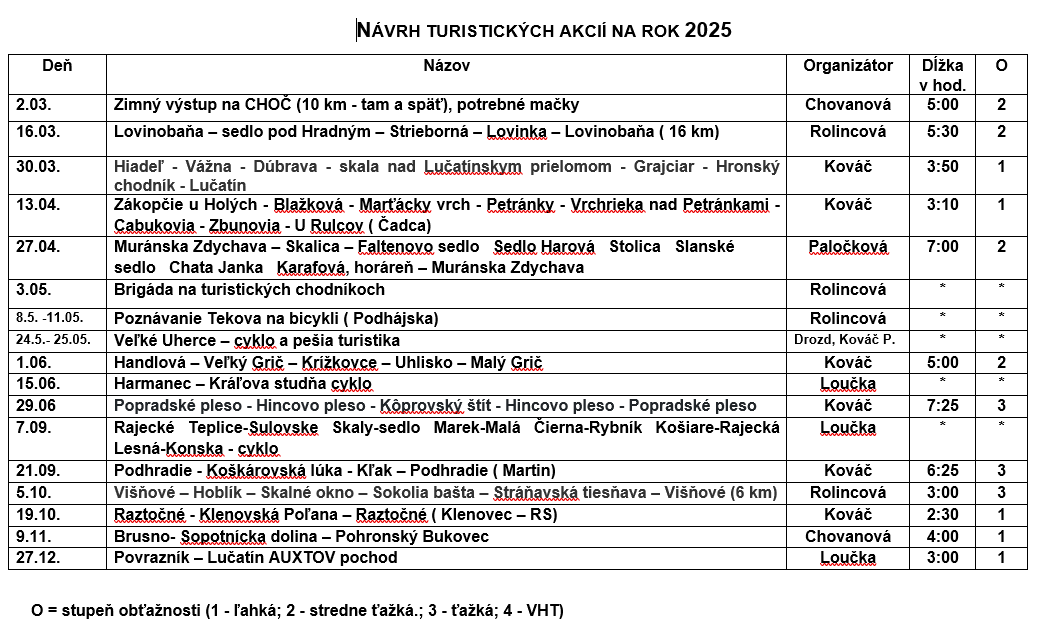 Pre novu sezónu 2020 pripravuje snaživý kolektív organizátorov v rámci možností, zaujímavý program s rôznym stupňom náročnosti, do známych aj menej známych kútov Slovenska.