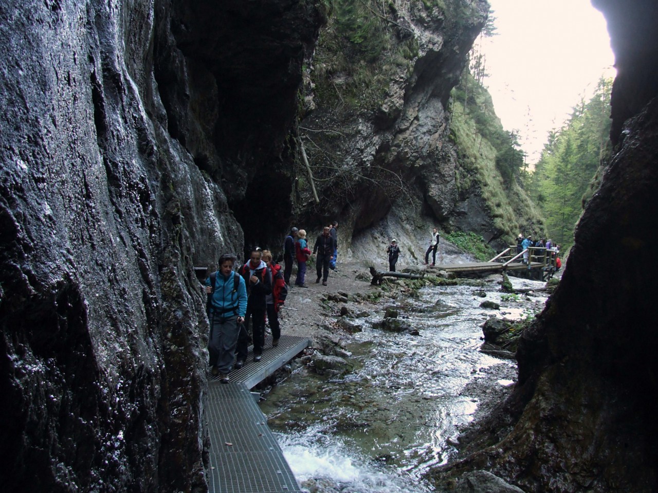 Občerstvili sme sa a začali zostupovať po novej zelenej značke, tento krát blatistým chodníkom k rázcestiu Pod Pálenicou. Vystúpili sme pod Poludňové skaly a vzápätí zišli do sedla Vrchpodžiar. Otvorili sa nám výhľady na hrebene Malej Fatry. Po krátkej pauze sme zišli k rázcestiu Podžiar a odbočili do poslednej tiesňavy - Dolné diery. Prekonali sme posledné železné lávky a mostíky. Od rázcestia Ostrvné pre nás už známou trasou popri potoku, sme zostúpili k hotelu Diery, našej poslednej zastávky.