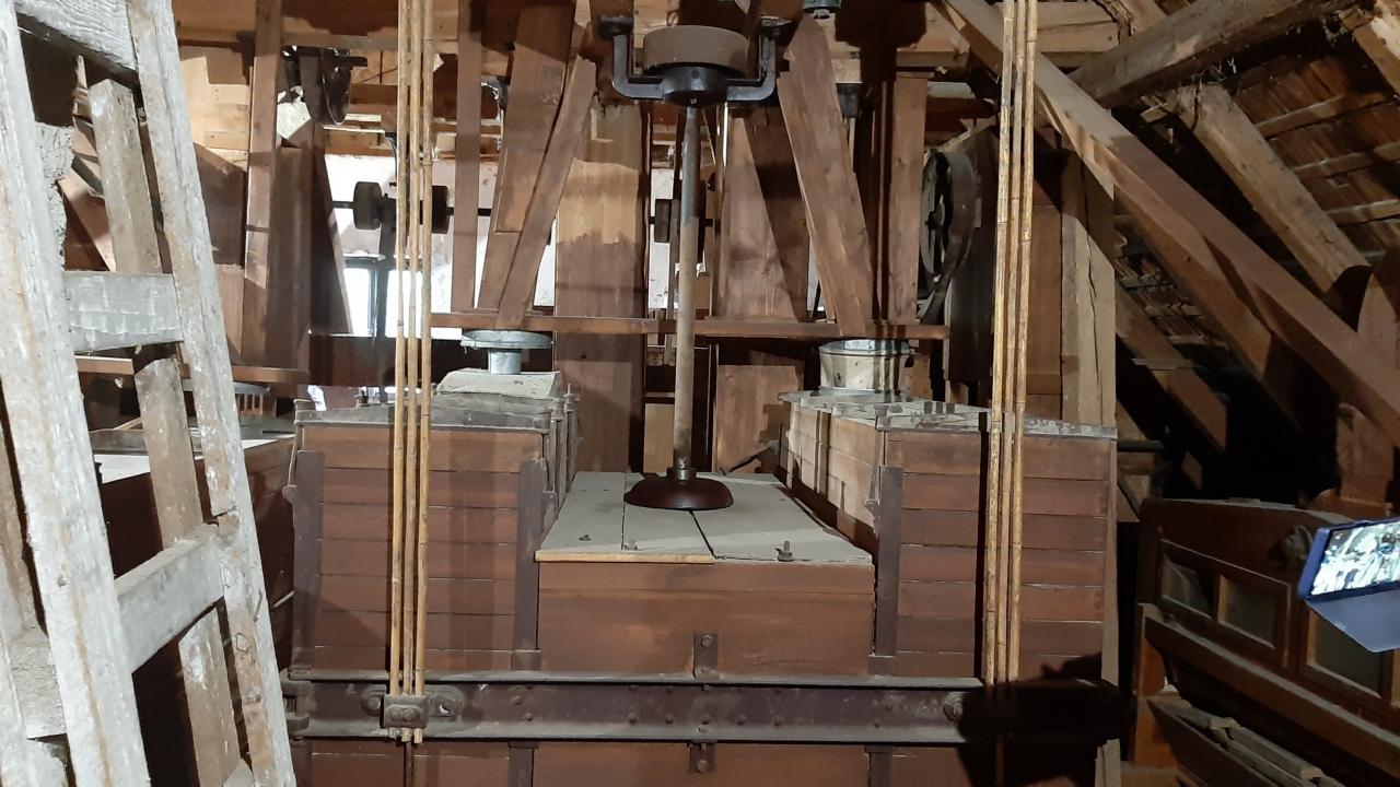 Privítali nás manželia Loučkový, ktorí v tejto obci vlastnia storočný mlyn, v ktorom nás ponúkli voňavým koláčom, kávou a čajom. Po malom občerstvení nám Peťo urobil prehliadku technologickej časti mlyna, ktorý je prekrásnou - zaujímavou a v súčasnosti historickou pamiatkou. Celý mlyn funguje v troch podlažiach. V spodnej časti (v pivničnej) je v základoch domu zabudovaná Francisciho turbína, ktorá roztáčala hriadeľ umiestnenú po celej dĺžke mlyna. Na hriadeli sú umiestnené kolesá na ktoré sa nahadzovali remenice, podľa toho ktorú mlynskú stolicu bolo potrebné nahodiť. V tejto časti mlyna sú osadené korčekové výťahy, ktoré mali za úlohu vyviesť zrno a následne múku do podkrovnej časti. V strednej časti sú umiestnené samotné mlynské stolice - 4 ks a tzv. šrotovník. V podkrovnej časti sú umiestnené tzv. trasliaky. Tieto zariadenia sú zavesené na 12 bambusových tyčiach. Vnútri sú jednotlivé sitá rôzneho priemeru. Tieto zariadenia mali za úlohu sitovať a tým pádom aj triediť pomletú múku. Všetci sme žasli nad takým úžasným dielom predkov Majky. V priestoroch pred mlynom je osadený gáter ( zariadenie na pílenie guľatiny) a turbína poháňala tento gáter, keď že sa tu pílilo aj drevo. Z informácii od Peťa, sme sa dozvedeli, že v týchto priestoroch tu bežne bývalo 100 kubíkov dreva.