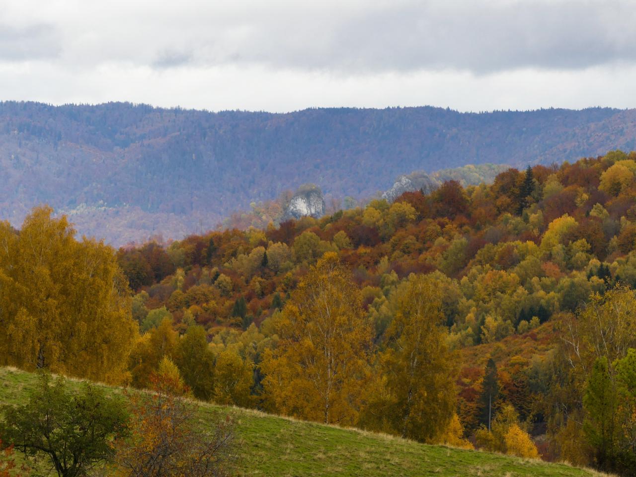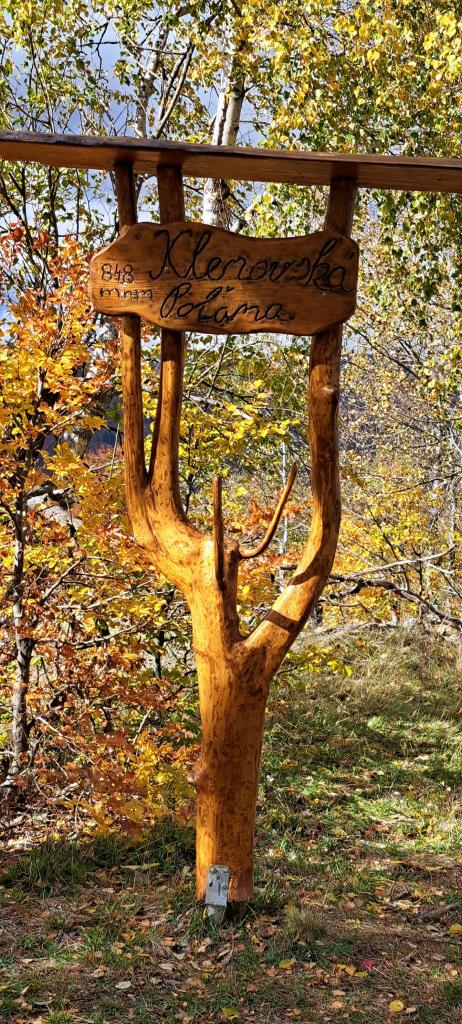 Budova penziónu je pamiatkovo chránený objekt postavený v I. polovici 20. storočia. Pôvodne slúžil ako krčma a konzum pre obyvateľov žijúcich a hospodáriacich na klenovských lazoch a bol ich prirodzeným centrom, kde sa konali jarmoky a spoločenské podujatia. Oproti krčme bola kolkáreň s betónovou plochou na tancovanie. Krčma a konzum prestali fungovať začiatkom 70. rokov minulého storočia. My sme si vybrali Veporskú stranu. Po pár metroch sme odbočili z asfaltovej cesty na nespevnenú cestu popod laz Sapúnske. Cesta viedla mierne do kopca cez lúky. Výhľady na okolité okolie začali od začiatku. Keď slnečné lúče vykukli spoza mrakov, nádherne osvietilo stromy z rôznymi odtieňmi farieb jesene. Za chvíľu sa otvoril nádherný pohľad na Klenovskú priehradu. Na pokojnej hladine vody sa odrážali mraky z oblohy. Nad vrcholmi Polomce a Hrbky sa dvíhala hmla. Postupne sme viac stúpali do kopca cez lúky pomedzi osamotené domy. Niektoré zívali prázdnotou. Pri jednom dome pod starým orechom našli sme maškrty. Krátke občerstvenie a stúpali sme ďalej cez lúku. Otvorili sa pohľady na Ostrú, Ohrablo,  Slopovo, Cisársku hoľu, Železnú bránu, Šopisko, Machnáčov Grúň, Klenovský Vepor. Pripojili sme sa na zelenú turistickú značku, ktorá viedla až na vrchol. Tesne pod vrcholom sa začali otvárať pohľady aj na druhú stranu - Klen, Okrúhla skala, Hradová. Po pár metroch sme prišli na vrchol Klenovská Poľana, vo výške 848 m. Tu už boli výhľady na všetky strany, najviac zaujala Muránska planina. Mraky a slnečné lúče sa striedali, vznikali nádherné pohľady jesene. Keď prestalo svietiť slnko a začal fúkať vietor, pocítili sme príchod zimy. Po krátkom občerstvení sme začali zostupovať chodníkom cez lúku smer Viliamová. Slnko sa znovu vrátilo a osviežilo pohľady na okolité lúky, usadlosti, vrcholy i ovčie stáda. Zaujal aj ďalší orech. Stále sme klesali lúkami do doliny. V doline popri Ráztočnom potoku sme za chvíľu prišli na asfaltku. Po pár minútach sme boli pri autách, kde sme túru ukončili. Autami sme sa zastavili v Kokave nad Rimavicou, v reštaurácii Kokavská izba, kde nás čakalo dobré jedlo. Reštaurácia bola ozdobená strašidlami. Strašil nás Helloween. Tu sme sa rozlúčili a autami cestovali do Lučatína.